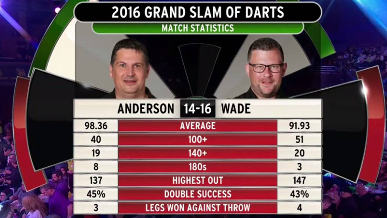Im 20. Leg vergab Anderson eine Breakchance, stattdessen glich Wade wieder aus. In der Folge lieferten sich die beiden Kontrahenten einen Schlagabtausch auf Augenhöhe. Zwischendurch legte Anderson sogar sieben perfekte Darts zum Leggewinn hin. Allerdings hatte Wade immer einen kleinen Vorsprung gegen Ende der Partie.