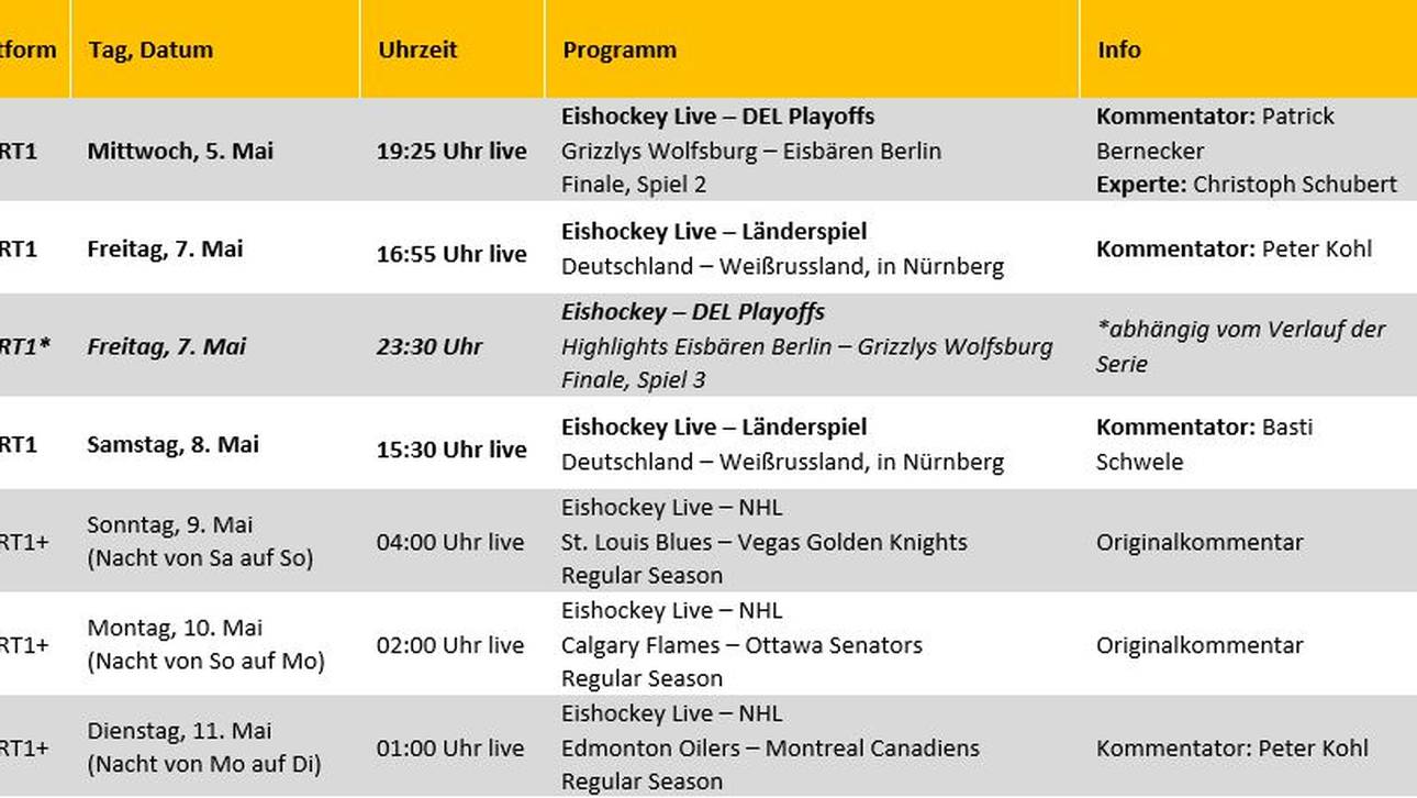 Zudem gibt es in dieser Woche am Freitag ab 16:55 Uhr und am Samstag ab 15:30 Uhr die letzten beiden Testspiele in der deutschen WM-Vorbereitung gegen Weißrussland zu sehen. SPORT1+ überträgt anschließend weitere Livespiele aus der NHL mit deutscher Beteiligung. Unter anderem sind Tim Stützle mit den Ottawa Senators sowie Leon Draisaitl und Dominik Kahun mit den Edmonton Oilers im Einsatz (Sendezeiten siehe Übersicht).