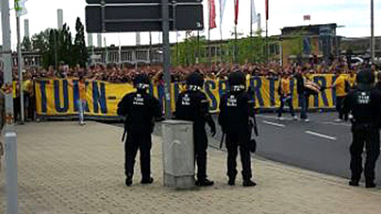 Beim Braunschweiger Fanmarsch zum Stadion setzte die Polizei Wasserwerfer ein, weil einige Anhänger offenbar die von den Sicherheitskräften vorgegebene Route verlassen wollten und mit Flaschen geworfen hatten. Rettungswagen waren ebenso im Einsatz.