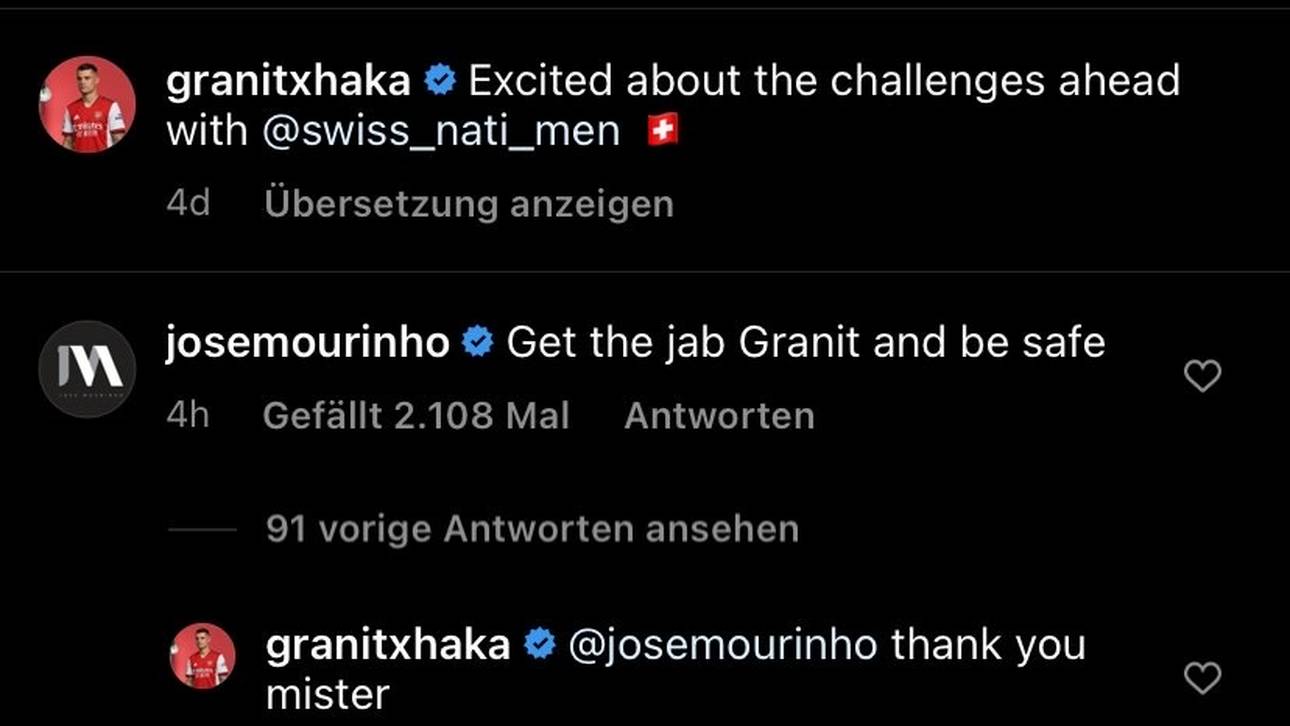 Dafür nutzte der charismatische Portugiese seinen Instagram Account, auf dem er seine Fans regelmäßig mit teils skurrilen Posts unterhält. Er kommentierte Xhakas neuestes Bild kurz, aber eindeutig: „Lass dich impfen, um sicher zu sein!“ Ein klassischer Mourinho.