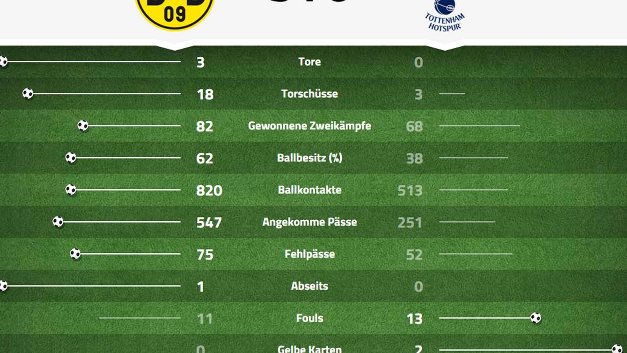 • Insgesamt war der BVB in allen wichtigen Statistiken überlegen. Vor allem die Torschussbilanz von 18:3 spricht eine deutliche Sprache.