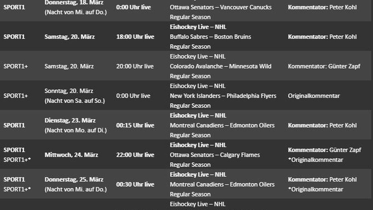 Die kommenden NHL-Sendezeiten auf den SPORT1 Plattformen in der Übersicht: